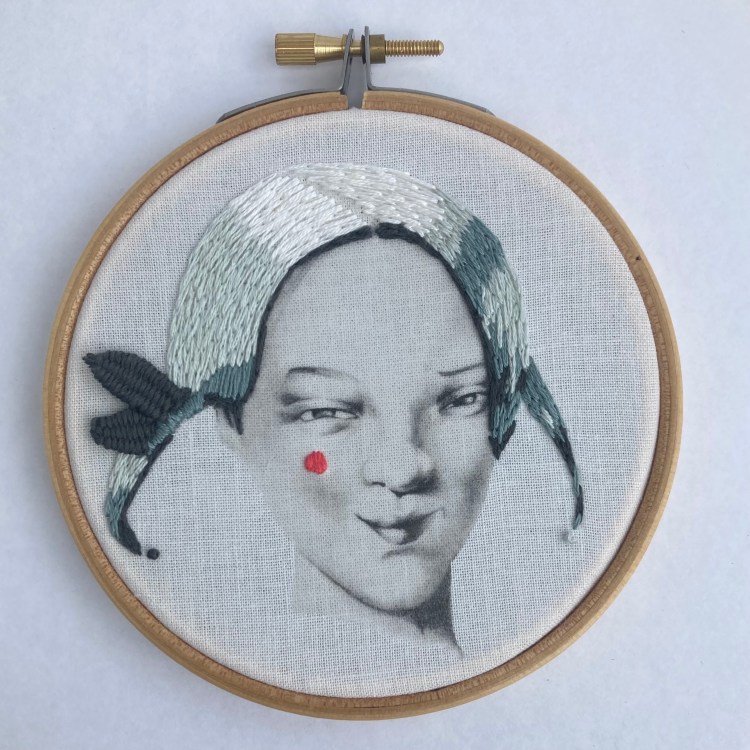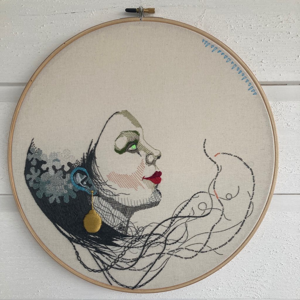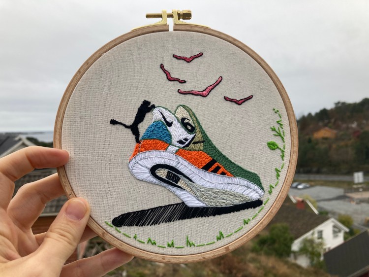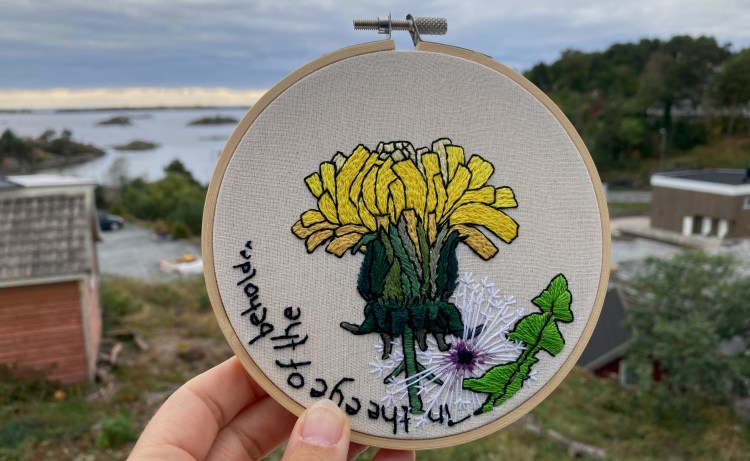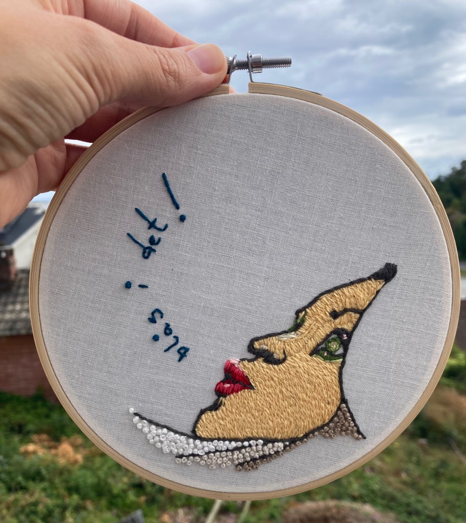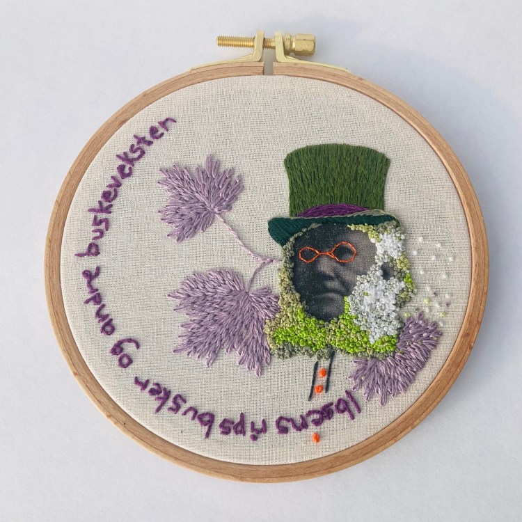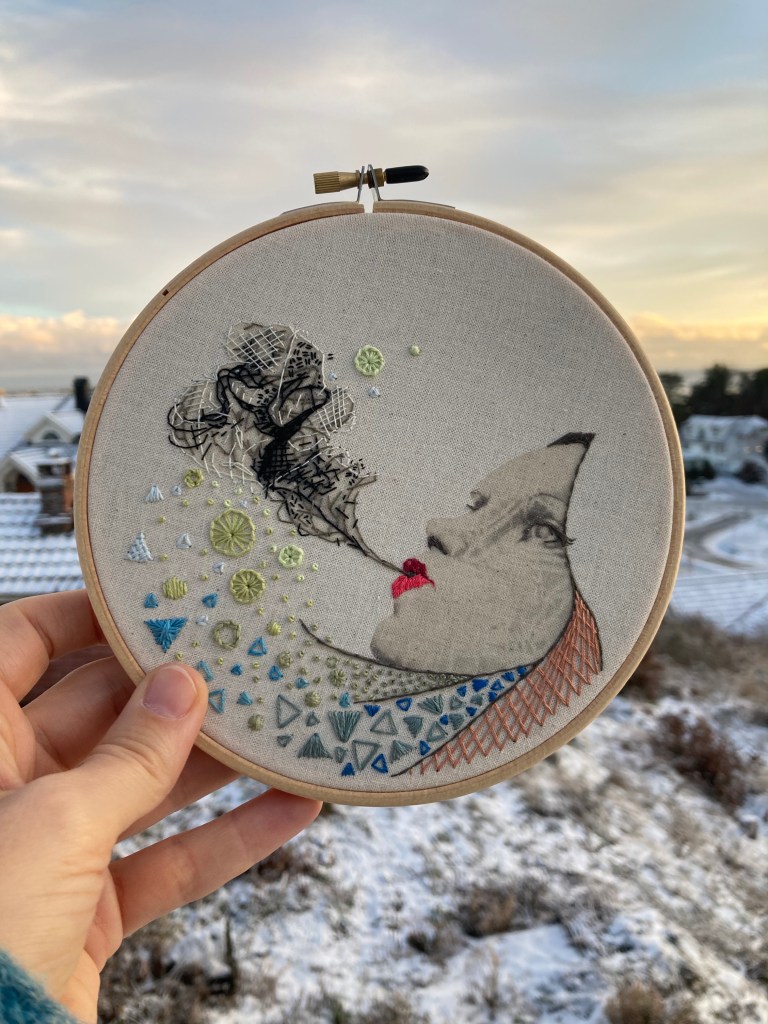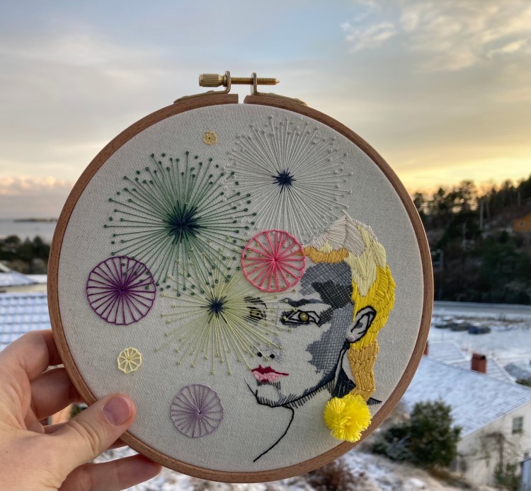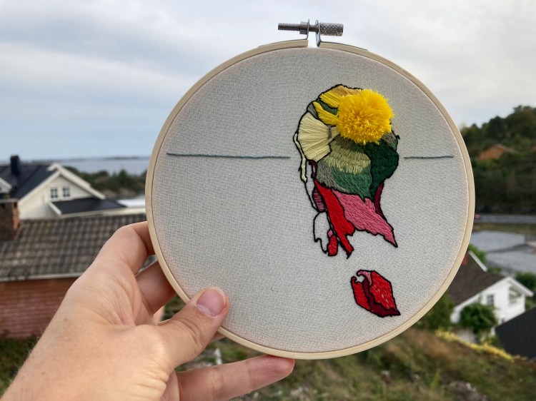 Ofte brukes tegningene mine i broderiene, enten som underlag hvor stingene skjuler tegningen helt, eller med trykk av tegningen som en del av bildet.