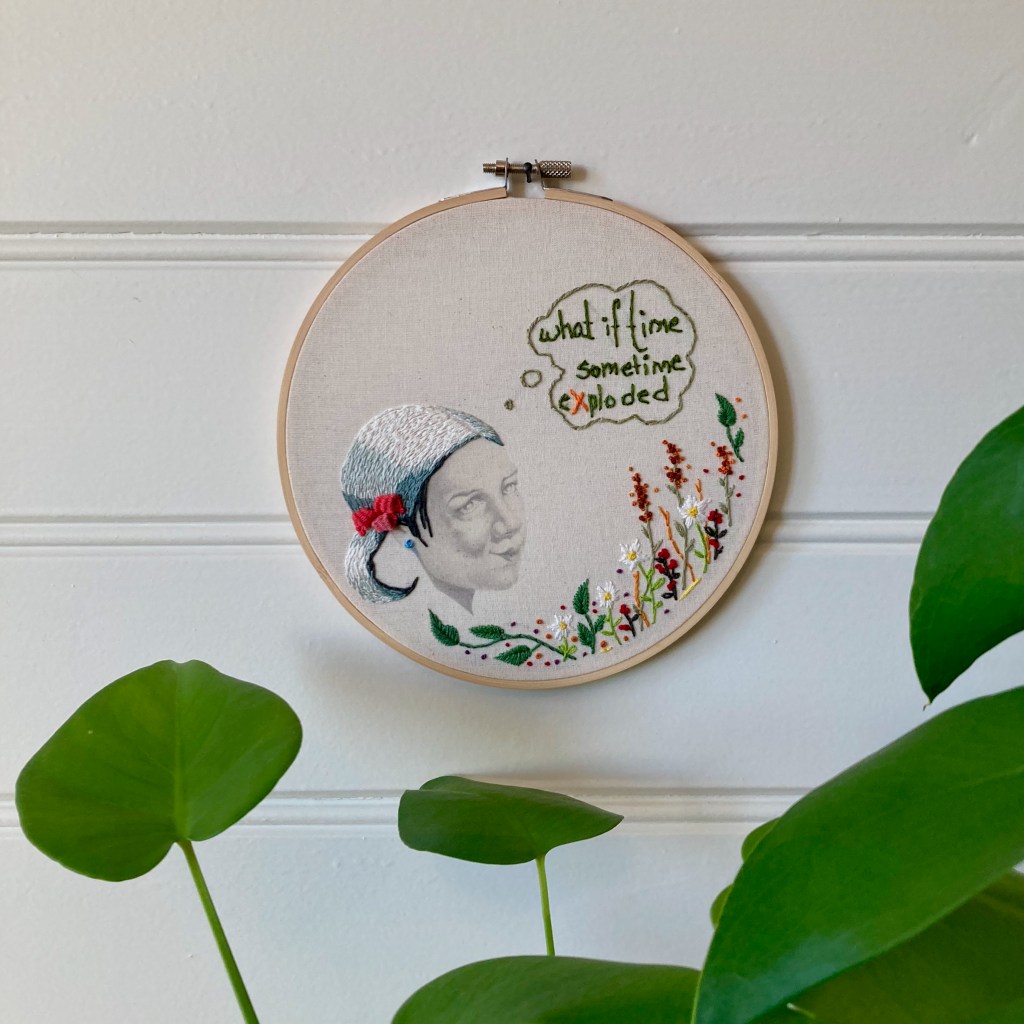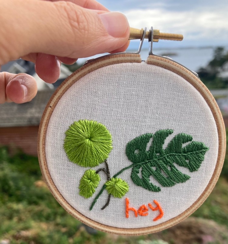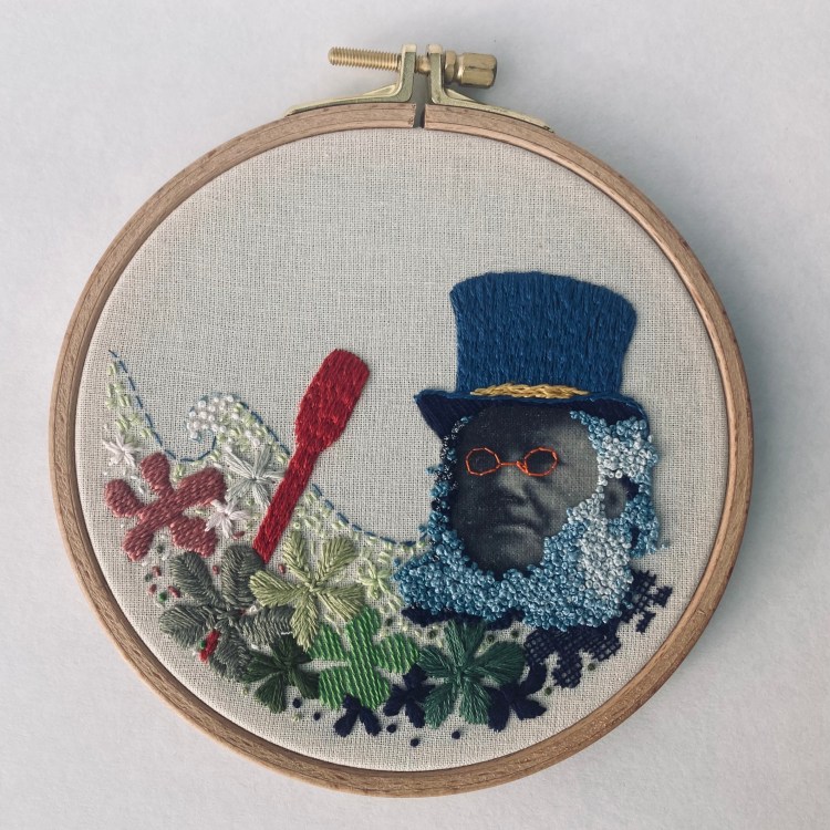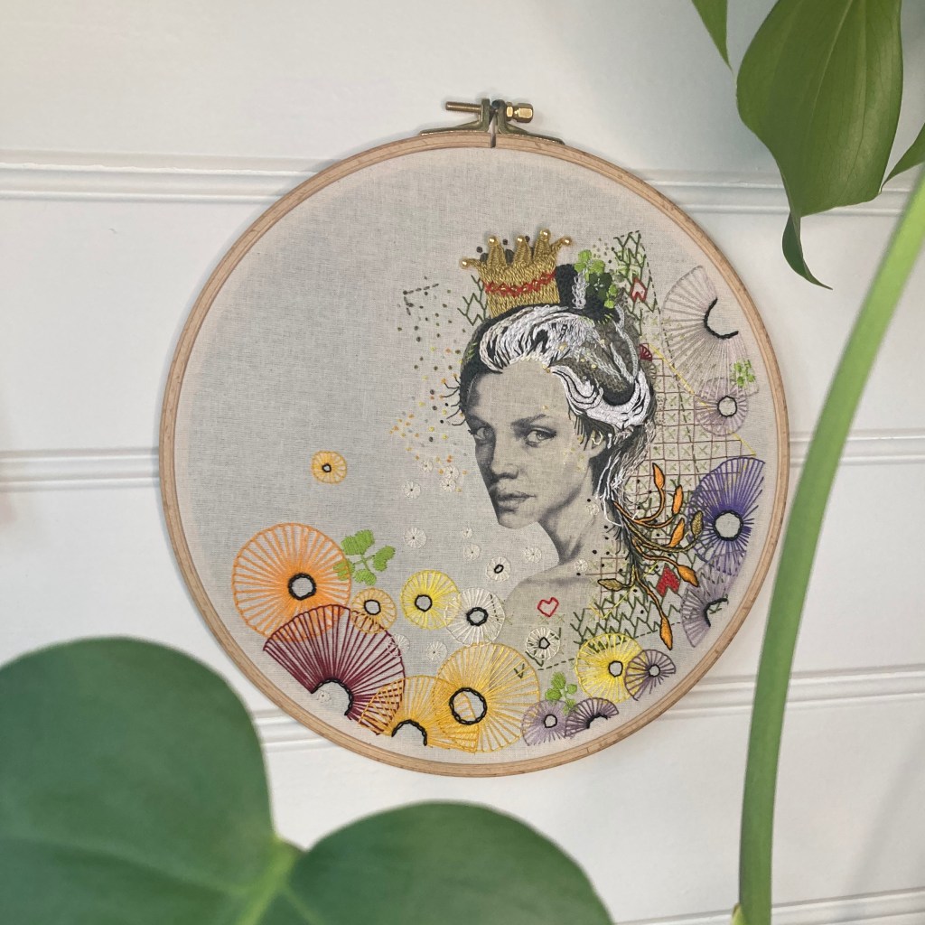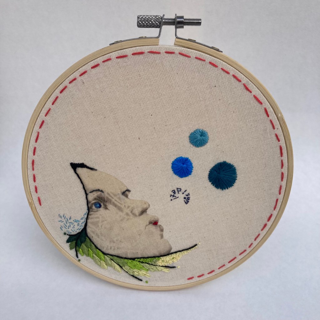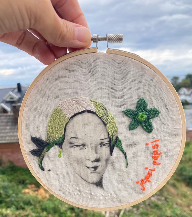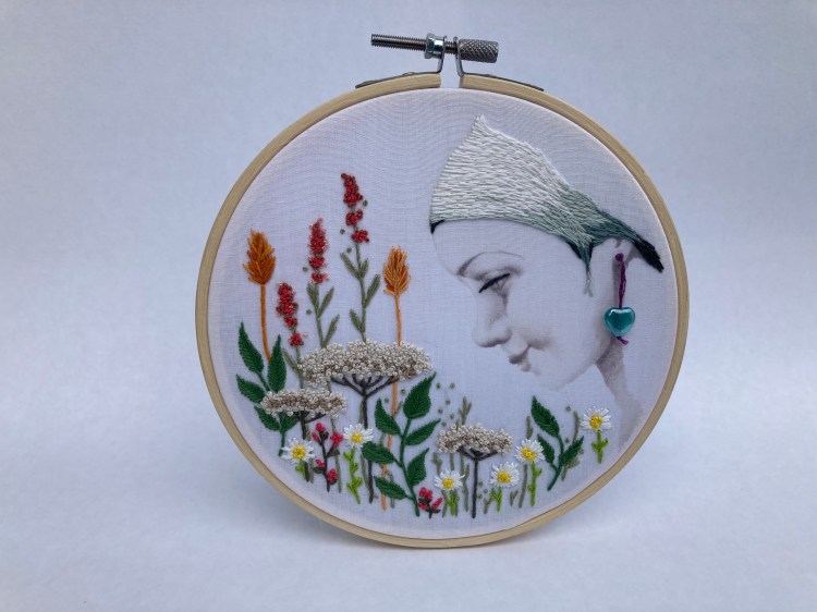 Ofte brukes tegningene mine i broderiene, enten som underlag hvor stingene skjuler tegningen helt, eller med trykk av tegningen som en del av bildet.